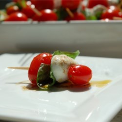 A great way to serve tomato mozzarella salad. Great presentation. Always a hit. You can find the bite-sized mozzarella at most supermarkets. If they are on the larger side, cut them in half.